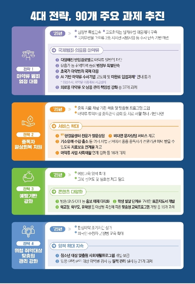 이번 시행계획은 「제1차(’25~’29) 마약류 관리 기본계획」의 4대 전략인 ▲마약류 범죄 엄정 대응 ▲중독자 일상회복 지원 ▲예방기반 강화 ▲위험 취약대상 맞춤형 관리 강화를 중심으로 총 90개 과제를 추진하는 것이 골자다.