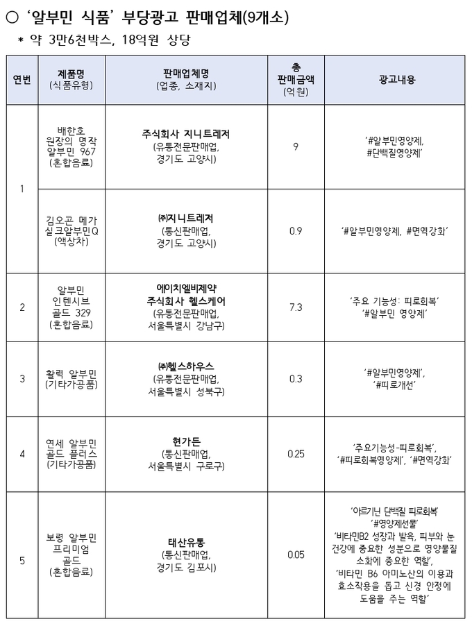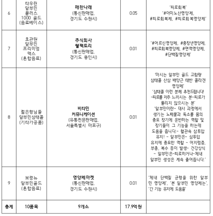 이번 점검에서 가장 두드러진 문제는 ‘부당광고’였다. 적발된 9개 업체는 알부민 식품을 ‘피로회복’, ‘간 기능 개선’, ‘알부민 영양제’ 등으로 홍보하며 건강기능식품으로 오인하도록 유도했고, 원재료의 생리적 기능을 제품 효능처럼 과장하는 방식으로 약 18억 원 상당을 판매한 것으로 드러났다.