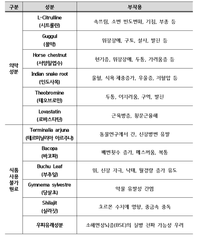당뇨병 관련 제품에서도 ‘당살초(Gymnema sylvestre)’ 등 식품에 사용할 수 없는 원료와 의약성분, 우피 유래 성분 등이 확인됐다. 당살초의 경우 약물 유발성 간염을 일으킬 수 있으며, 인슐린과 병용 시 저혈당 위험을 높일 수 있어 각별한 주의가 필요하다.