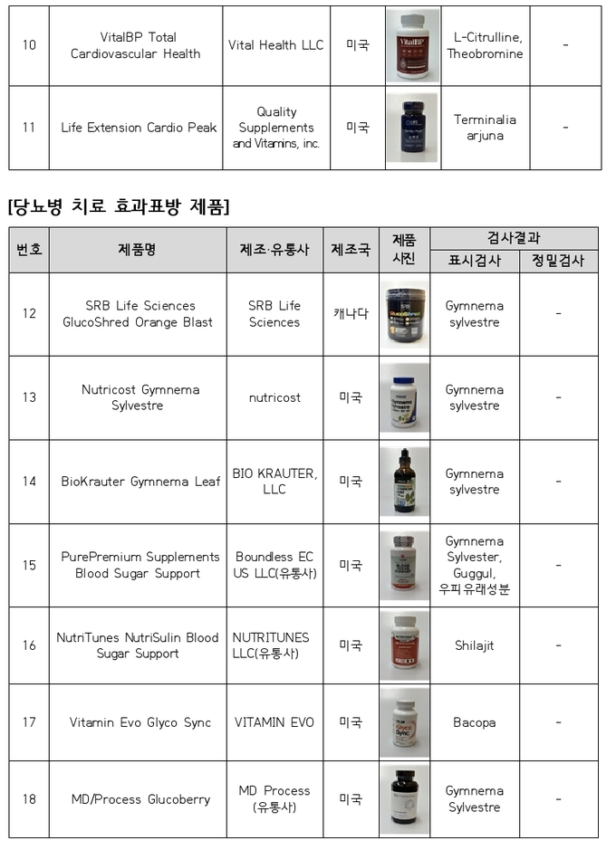 이번 조사는 소비자 관심이 높은 만성질환 관련 제품을 중심으로 진행됐다. 고지혈증·고혈압 치료 효능을 표방한 제품 20개와 당뇨병 관련 제품 10개 등 총 30개를 아마존, 이베이 등 해외 온라인 쇼핑몰을 통해 구매해 분석했다.