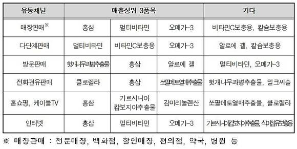 유통채널별 상위 매출품목의 경우 전문매장, 백화점 등 매장판매는 홍삼, 다단계판매는 멀티비타민, 방문판매는 헛개나무과병추출물, 홈쇼핑·케이블TV는 홍삼, 전화권유판매는 클로렐라 등이 차지하였다.