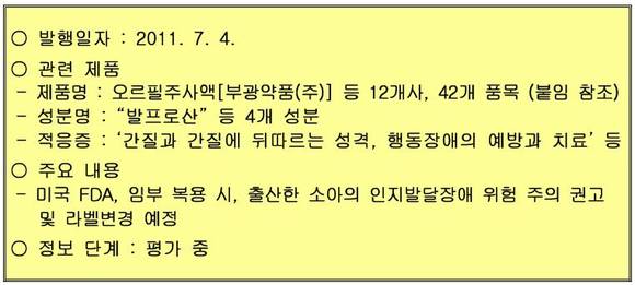 이에 따라 식약청은 간질 치료제 “발프로에이트 제제(발프로산, 발프로산나트륨, 디발프로엑스나트륨)”를 임부가 복용 시, 출산한 소아의 인지발달 장애 위험에 따라 주의하여 사용할 것을 권고하였다.