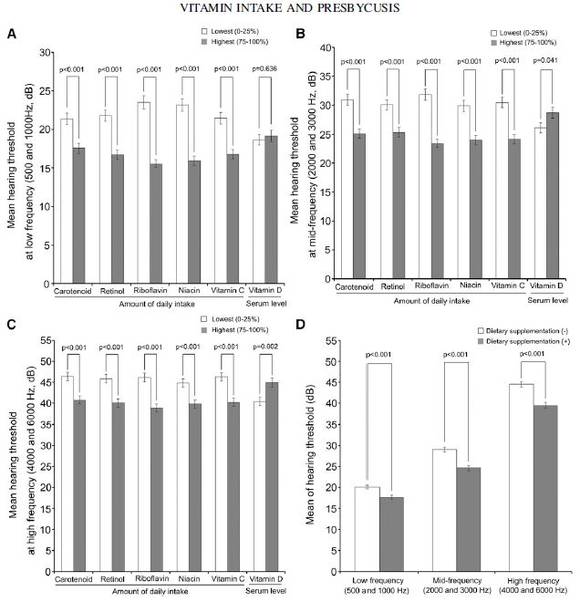 또한, 연구팀은 비타민 A의 한 종류인 레티놀(retinol), 비타민 B군의 일종인 리보프라빈(riboflavin), 나이아신(niacin) 등의 비타민도 섭취량이 증가할수록, 보다 나은 청각 역치(가장 작은 소리를 들을 수 있는 한계)와 상관관계가 있을 가능성을 확인했다. 이와 더불어, 연구팀은 영양제를 복용하고 있는 노령인구에서 보다 나은 청력을 보이는 것을 확인했다.