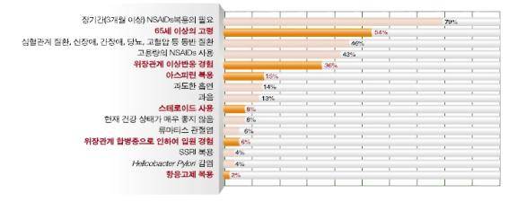 전체 환자군에서 가장 빈도가 높은 위험인자는 장기간(3 개월 이상)의 NSAIDs 복용 필요(79 %)와 65 세 이상의 고령(54 %)이었고, 그 외 위장관계 사건의 병력(36 %), 아스피린 복용(15 %)도 위장관계 합병증의 위험 요인인 것으로 나타났다(표 2).