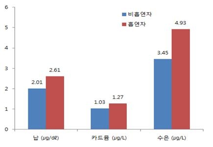 특히, 남자의 경우 음주와 흡연을 동시에 하는 집단이 비음주 비흡연 집단에 비해 체내 중금속 농도가 2배 이상 높았다.