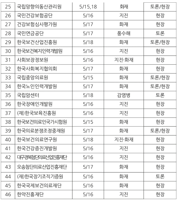 아울러, 훈련 기간 중 복지부 소속(24개)·산하기관(22개)에서도 감염병 대응훈련, 지진 및 화재 대피훈련 등 기관의 특성에 맞게 자체훈련을 실시한다.