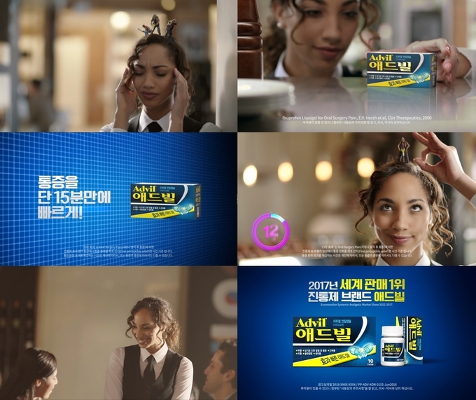 광고 영상은 식당에서 서빙을 하는 종업원이 두통으로 인해 마치 머리에서 공사가 일어나는 듯한 통증을 느끼지만 애드빌® 리퀴겔 복용 이후 15분 이내 빠르게 완화1시키는 에피소드로 구성해, 소비자들이 일상 속에서 두통을 겪을 때의 느낌과 애드빌®의 빠른 통증 완화 효과1를 쉽게 공감할 수 있도록 제작되었다.