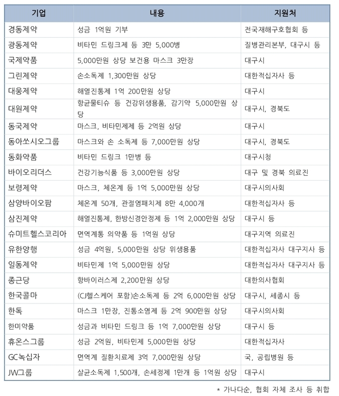 이를 위해 의약품 등 물품과 성금을 지원하고, 환자가 집중적으로 발생하고 있는 대구·경북 등의 지역에서 환자 치료·방역 활동을 하고 있는 지자체와 단체를 돕기로 했다. 현장에서 고군분투하는 의료인력들과 환자 등에게 보건용 마스크와 손 소독제, 체온계, 비타민제, 해열진통제, 면역강화제 등을 지원한데 이어 물량을 확대 공급할 계획이다. 경증 질환자를 선별, 수용하고 있는 대구시와 경북 생활치료센터에는 면역강화제와 비타민제 등을 집중 지원하기로 했다. 독거노인 등 취약계층에는 구호용품과 영양제 등을 공급할 예정이다.