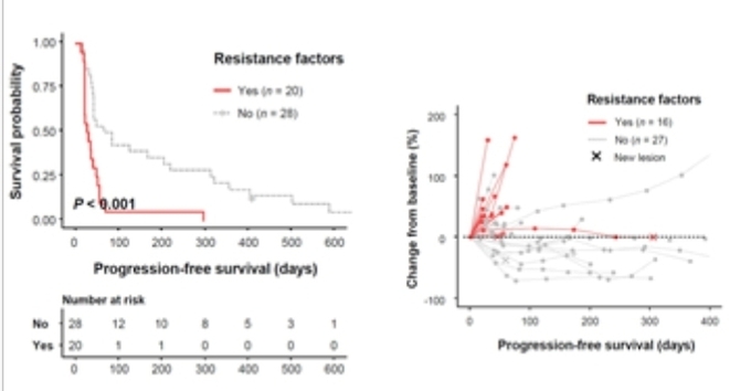 또한, 최근 주목받는 항 PD-1/PD-L1 면역관문억제제로 치료받은 48명의 환자를 분석한 결과, 병리 조직 검사상 종양을 침투하는 ‘T 면역세포가 많은 환자’에서 면역항암제 반응이 좋았다.