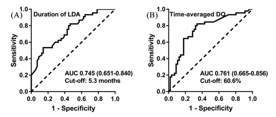 특히, 질병 조절 기간이 5.3개월 미만인 경우. 예측의 정확도가 AUC(곡선하면적) 값 0.745으로 질병 악화를 예측할 수 있었다. 종양괴사인자 억제제의 용량을 표준 용량의 60.6% 이하로 감량한 경우에는 AUC(곡선하면적) 값이 0.761인 것으로 나타났다.