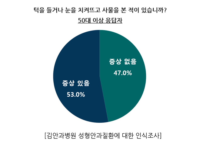 김안과병원(원장 장재우)은 전국 성인남녀 1,000명 대상의 ‘성형안과질환에 대한 인식조사 ’에서 눈의 노화 증상 중 하나인 후천적 눈꺼풀처짐 증상에 대한 조사를 실시했다. 그 결과 50대 이상인 400명 중에서 53%가 눈꺼풀처짐 증상을 경험한 것으로 조사되어 예상보다 많은 사람들이 이 증상을 느끼는 것으로 나타났다.