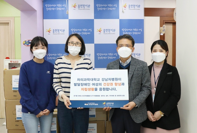 강남차병원은 강남 충현복지관에 생리대와 냄비 및 식기도구 등을 전달했다. 충현복지관은 지적, 자폐성 장애인의 재활과 평생복지를 위해 설립된 장애인종합복지관으로 발달장애인의 독립생활을 지원하고, 생애주기별 맞춤형 복지서비스를 제공하고 있다.