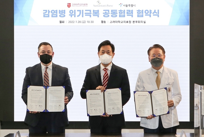고려대학교의료원(의무부총장 겸 의료원장 김영훈)과 서울특별시(시장 오세훈), 재단법인 사마리안퍼스코리아(대표 크리스토퍼 제임스 위크스)가 28일 감염병 위기 극복을 위한 협약을 체결했다.