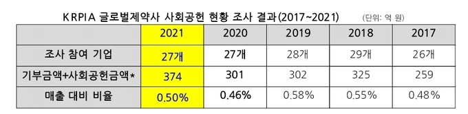한국글로벌의약산업협회(이하 KRPIA, 회장 오동욱)가 회원사를 대상으로 조사한 ‘2021년 글로벌제약사 사회공헌 현황’에 따르면, 설문에 참여한 27개 글로벌제약사들의 기부금을 포함한 총 사회공헌활동금액이 374억원으로 집계되었다고 밝혔다. 글로벌제약사들이 기부한 사회공헌활동 금액은 2015년 조사 집계를 시작한 이래로 지속적으로 증가하고 있으며, 지난해는 전년(301억원) 대비 약 24% 내외 증가했다.