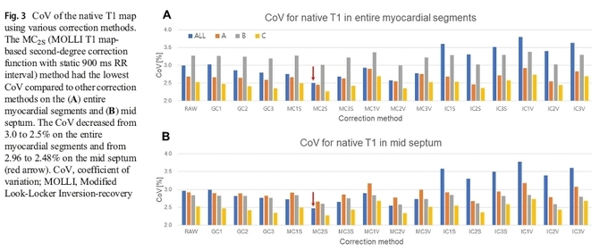 그 결과, 보정 전 각 기관별로 차이를 보였던 T1값이 보정 후에는 기관 간 차이가 없는 것으로 나타났다. 또한 같은 환자에서 측정값의 변동계수가 3%에서 2.5%로 낮아져 측정값의 오차가 작았다.