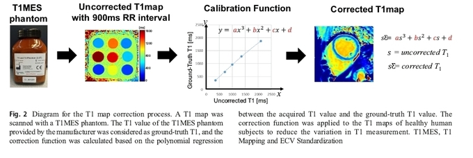이후 연구팀은 MRI에서 측정한 T1값과 세포외부피비율을 표준참조물질로 구성된 팬텀(T1MES)을 이용해 보정하고 보정값을 이전 T1값과 비교분석했다.