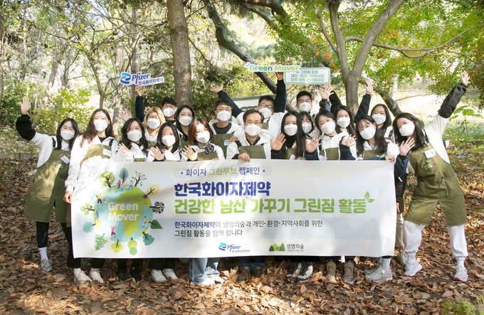 한국화이자제약(대표이사 사장 오동욱, https://www.pfizer.co.kr)이 11일 환경보호와 건강증진을 위한 그린 무브(Green Moves) 캠페인의 일환으로 임직원들과 함께 서울 남산에서 그린짐 활동을 진행했다고 밝혔다.