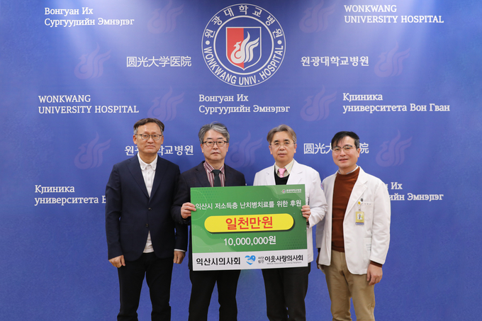 지난달 30일 익산시의사회・이웃사랑의사회(회장 이준섭. 본안과)가 지역사회의 저소득층 희귀난치성 질환 치료비에 써 달라며 원광대병원( 병원장 서일영) 에 의료비 일천만원을 기부했다.