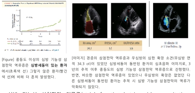 아울러 중등도 이상의 심방 기능성 삼첨판막 역류증이 발생한 경우 사망, 심부전, 판막질환으로 인한 수술 시행을 포함한 심혈관계 예후가 저명하게 악화된 것으로 나타났다.