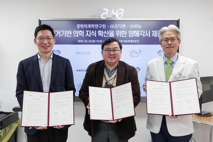 경희의과학연구원(원장 윤경식)과 헬스케어 콘텐츠 플랫폼 ‘위뉴’(대표이사 황보율) 그리고 경희디지털헬스센터에서 스핀오프 된 디지털치료제 스타트업 ‘오디엔’(대표이사 이상열, 경희대병원 내분비내과 교수)이 지난 2월 23일 근거기반 의학 지식 확산을 위한 협업 추진을 위한 3자간 업무협약(MOU)을 체결했다.