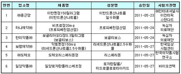 식약청은 지난주(‘11.5.23~5.27) 이반퀸정150mg 등 6개 품목에 대하여 생물학적동등성시험계획서를 승인하였다고 밝혔다.